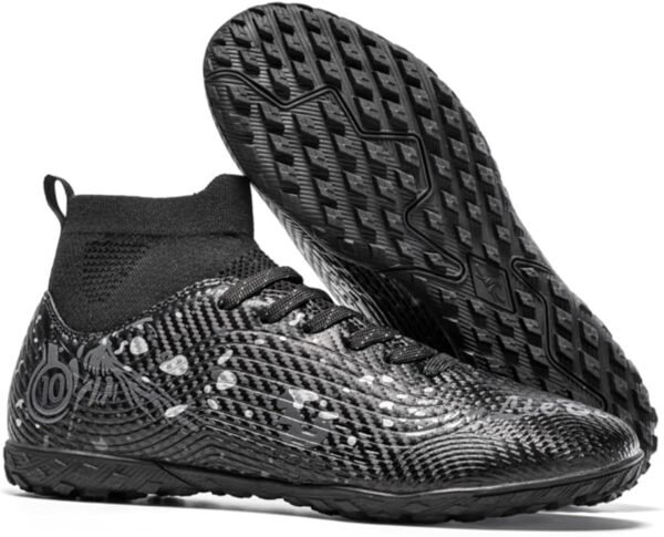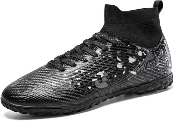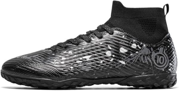 Botas de fútbol en color negro diseñadas para rendimiento y estabilidad. Upper ligero y transpirable, ajuste cómodo con collar alto y suela de goma antideslizante que garantiza tracción y control en cada movimiento. Ideales para entrenamientos intensos y partidos sobre césped artificial y terreno firme.